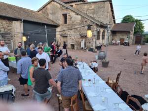 Avec sa grande salle en pierres apparentes, sa cour intérieure, et son espace extérieur avec vue sur la campagne, le lieu se prête aussi bien aux repas de famille en nombre qu’aux formats plus décontractés.