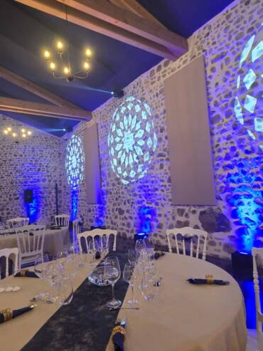 Une grande salle aux pierres apparentes ouverte sur la cour intérieure du château. Un volume généreux, brut et chaleureux à la fois, capable d’accueillir jusqu’à 200 convives assis, personnalisable avec tout le nécessaire en son et lumière pour faire vibrer vos invités jusqu’à l’aube.